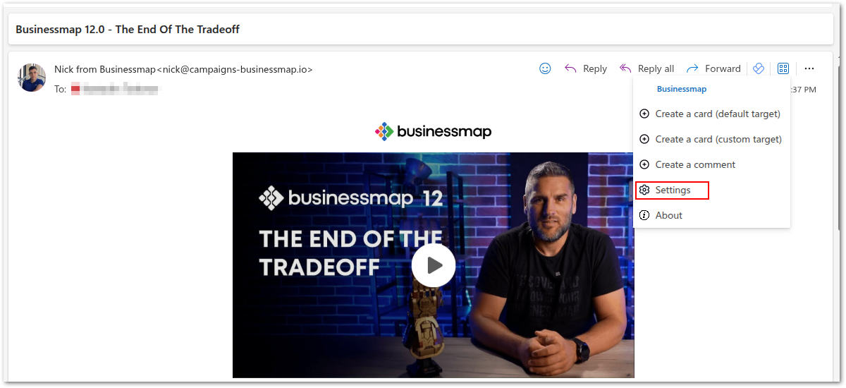 Step 2: After the installation, you can access the add-in from the menu of each message. Click on one message to set up the Businessmap logins and the default location where cards will be created.
