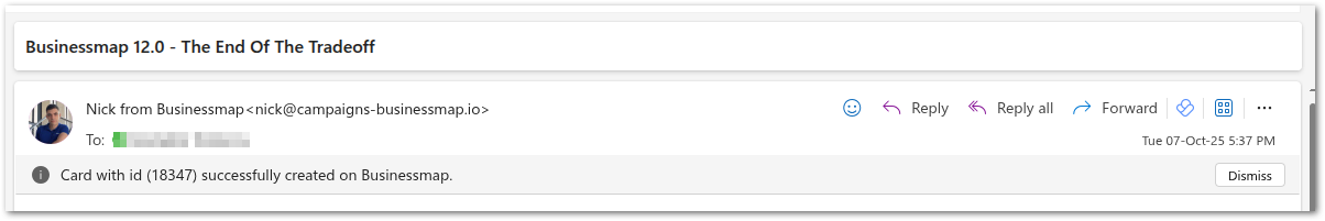 After a few seconds, a notification will appear on top of your email, saying the new card has been created: