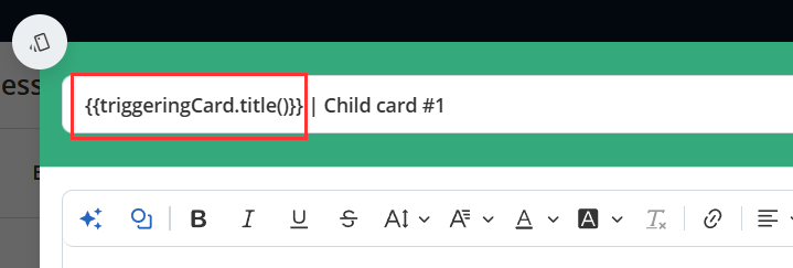 In some scenarios, you may want to transfer the property of one card into the title or the description of another. A common use case is prefixing the title of a child card (created via a rule) with the title of the parent card.