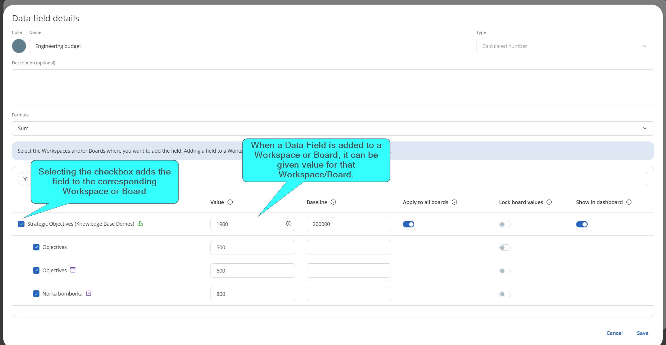 Calculated number (special type) – A numeric field entered manually at the board level, which is automatically aggregated at the workspace level.