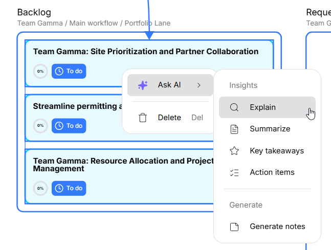 Unlock the power of AI with the new Insights section in Whiteboards. With just a click, you can generate detailed explanations, concise summaries, key takeaways, and actionable items based on the content of your cards or cells.