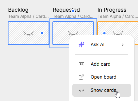 Cards can be shown or hidden via the context menu, giving you full control over what gets imported and displayed.