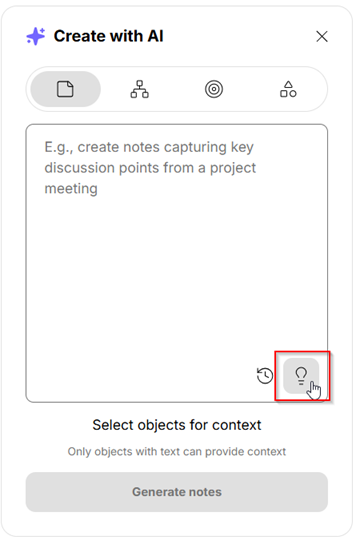 Stuck on what to ask the AI? The new “Suggest prompt” feature in the Create with AI panel generates 10 tailored prompt suggestions based on the context of your selected card, its parents, and any additional objects you’ve chosen. This makes it easier than ever to get started with AI-powered workflows and ensures you’re always asking the right questions.