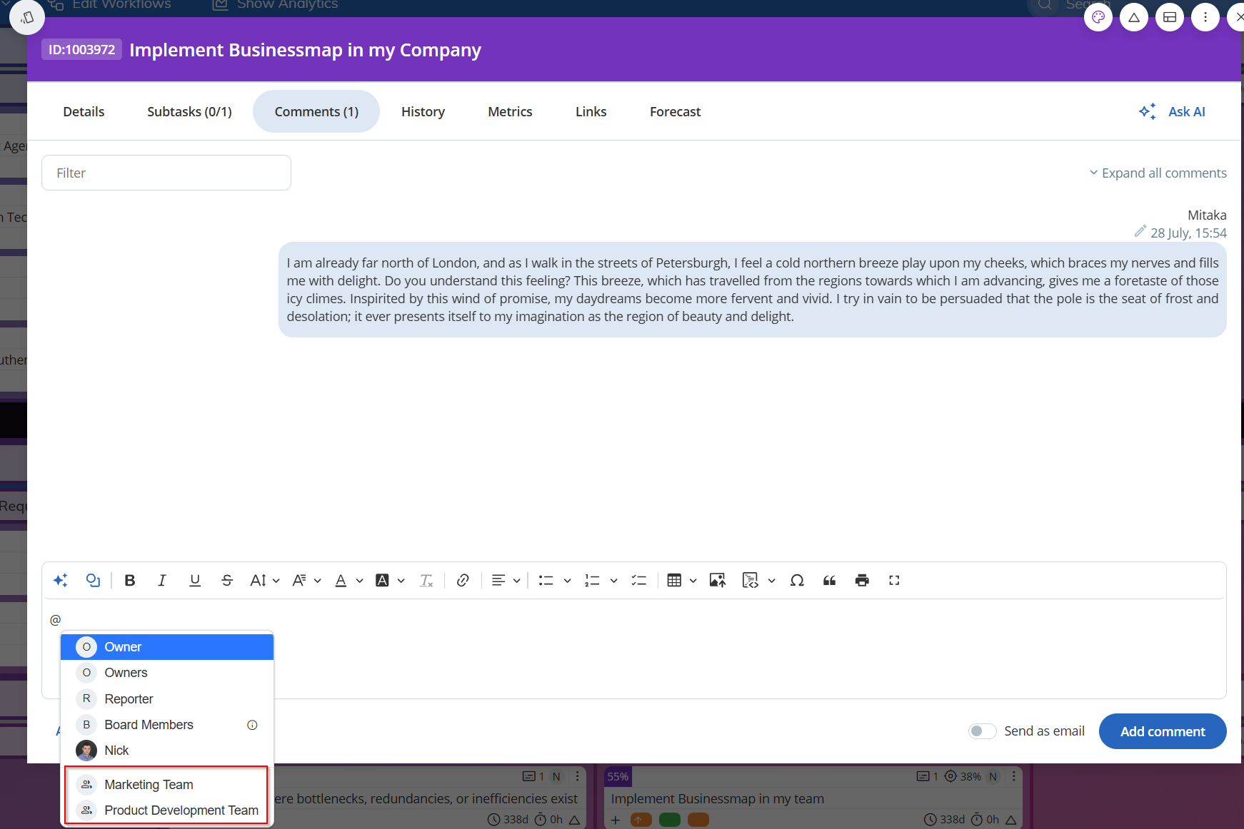We’ve made it easier and more intuitive to mention users and teams in your cards. Now, the “board members” option only sends mentions to users explicitly added to the board, giving you greater control. Teams added to the board appear at the bottom of the mention list, separated and with a special icon.