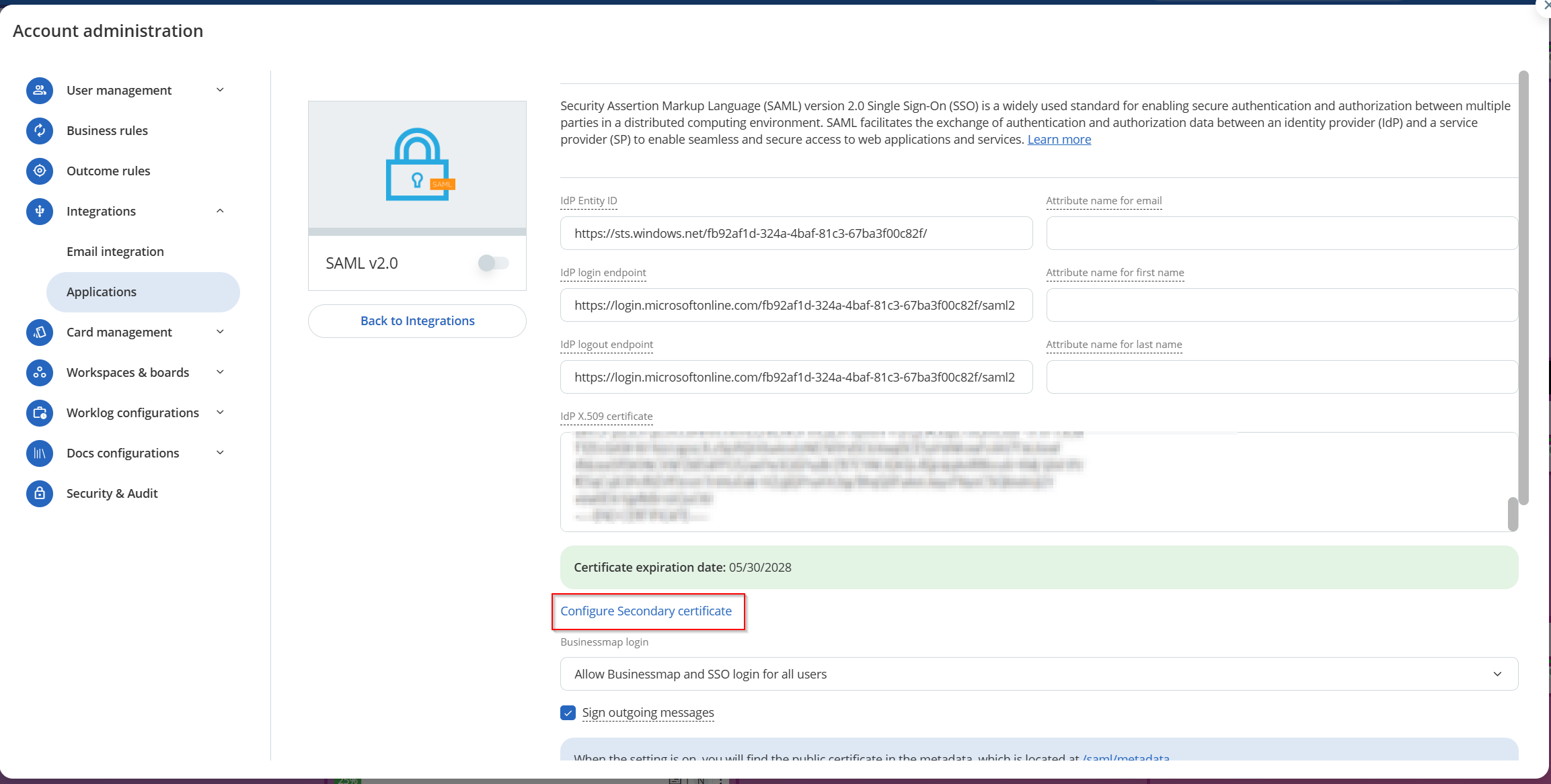 Security is a top priority, and now you can add a second certificate for authentication. This means you’ll have both a current and a future key, ensuring uninterrupted access even if one key expires. The UI clearly displays the expiration date for each key, using color coding for quick status checks. If the primary key expires, the system will automatically use the secondary key, so your users can always log in securely. This feature is especially valuable for organizations with strict security requirements and frequent key rotations.
