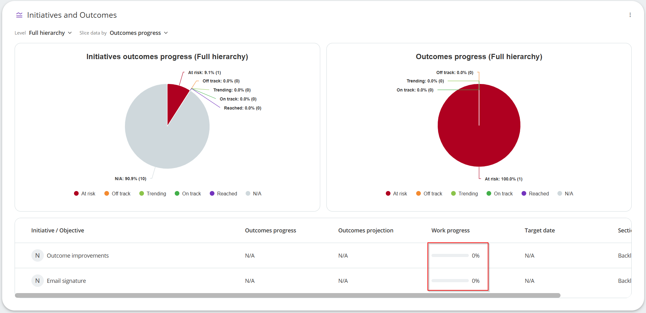 For initiatives that haven’t started yet, the widget now displays 0% progress and uses color coding to indicate delays, instead of showing N/A. This provides clearer, more actionable information and ensures that your dashboards and charts always reflect the true status of your initiatives.