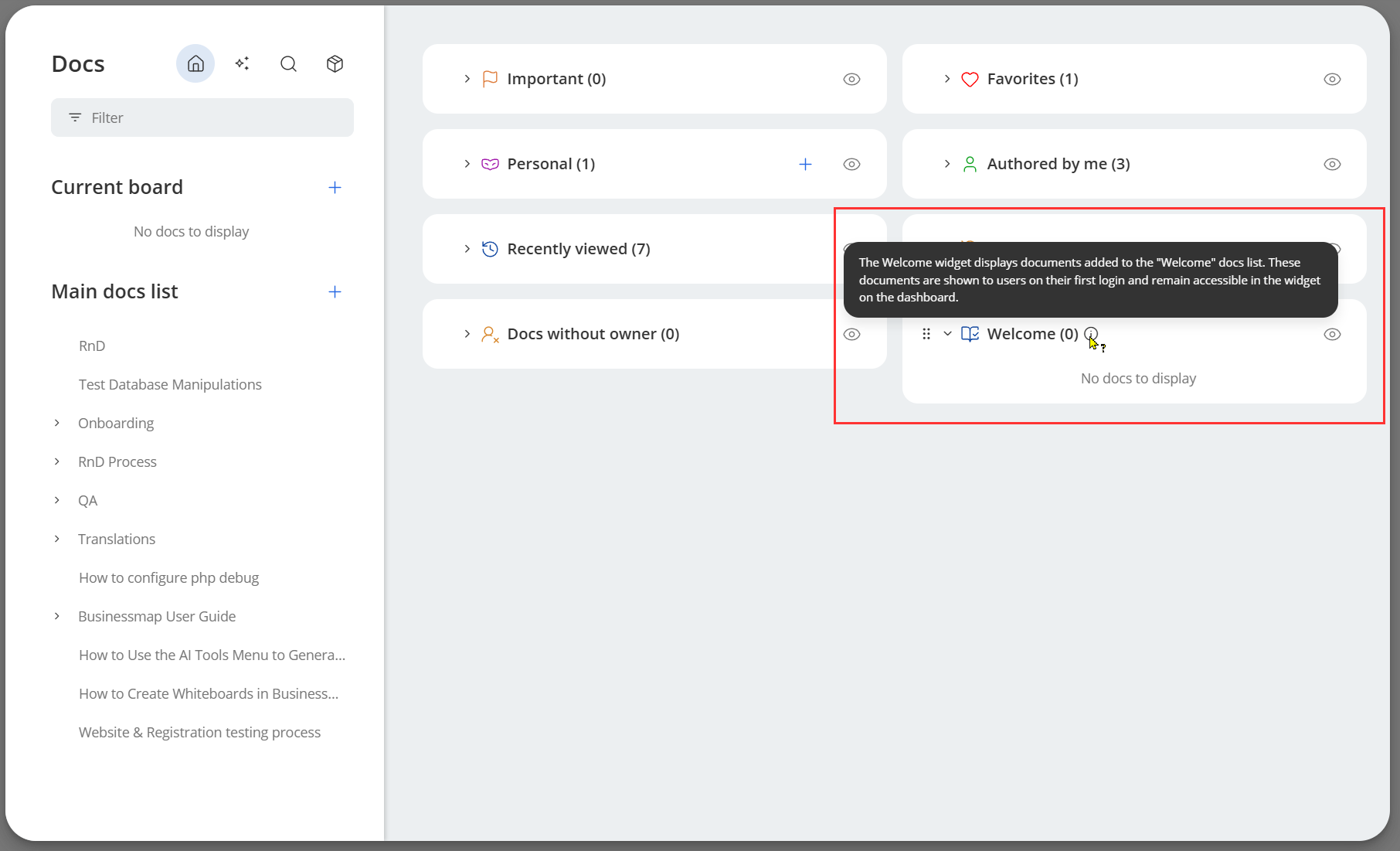 First-time users are now greeted with a welcoming modal displaying all designated "Welcome" Docs upon login. If more than one Welcome Doc exists, navigation buttons appear automatically. Users can also favorite Welcome Docs for quick future access, making onboarding smoother from day one.