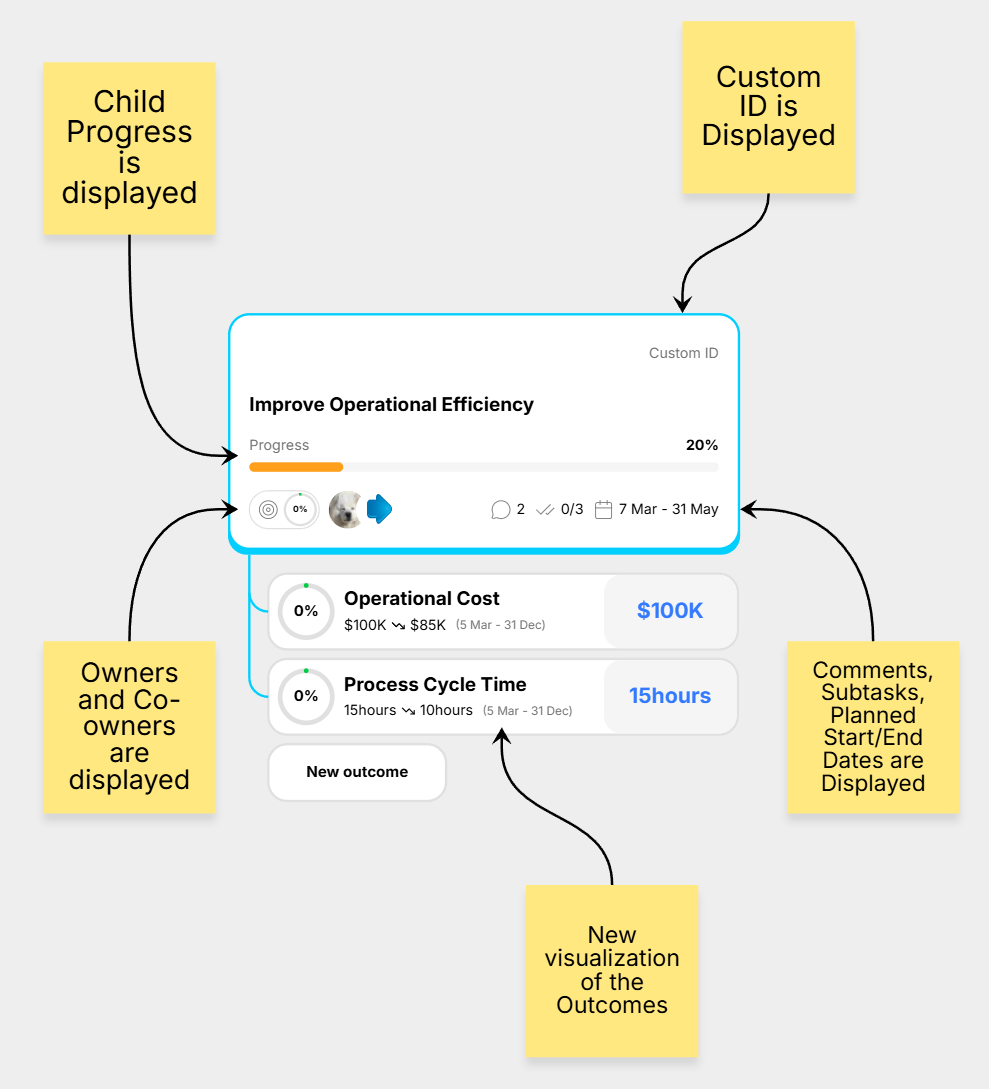 You'll enjoy an improved visualization for outcomes, with streamlined search functionality—including for outcomes not yet connected to any card—and easier linking with initiatives. The updated permissions model ensures owners have complete visibility and control, while all users can manage their own outcomes wherever they are added.