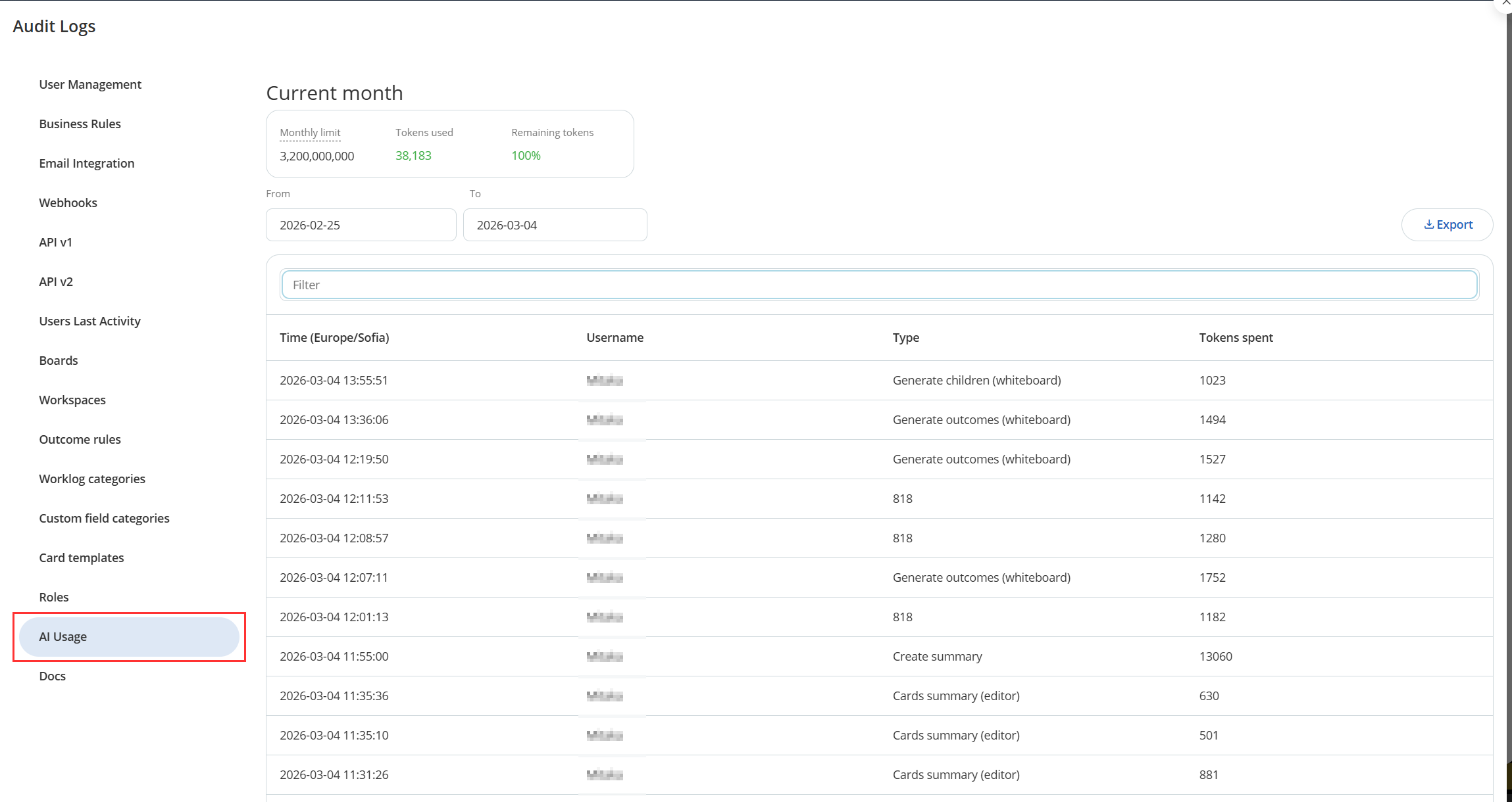 Stay informed about your organization's AI token consumption with a comprehensive audit log section. Admins and users with security/audit privileges can see month-to-date usage, remaining tokens, and percentage indicators. Usage history is also accessible, complete with export and filtering capabilities for deeper analysis. This feature ensures transparency, improves resource management, and helps maintain control over your AI-driven functions.