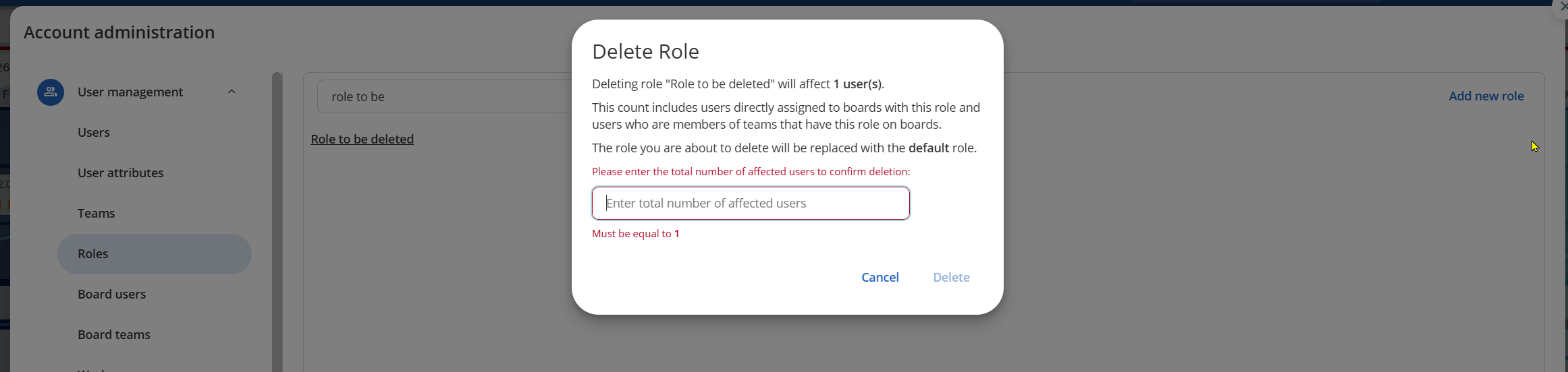 When an active role is being deleted, the system will ask you for a confirmation. This prevents the accidental deletion of active roles still being used.