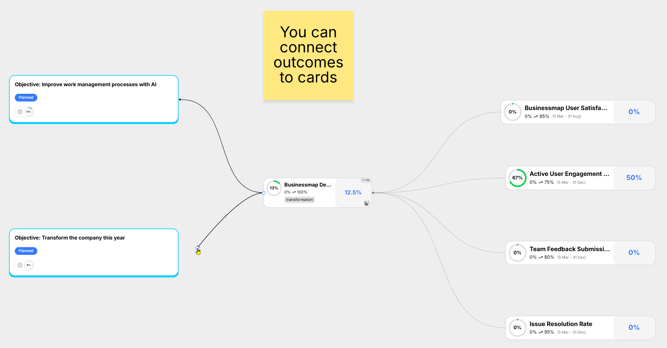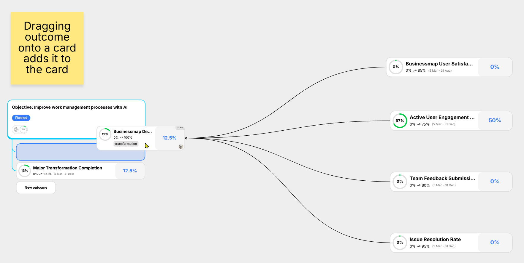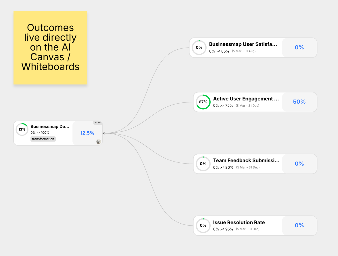 Outcomes are now truly global, meaning you can create standalone outcomes in AI Canvas / Whiteboards, link them to multiple cards and areas, and easily reposition them wherever needed. You're no longer limited by card associations—outcomes can exist and thrive independently across your account.