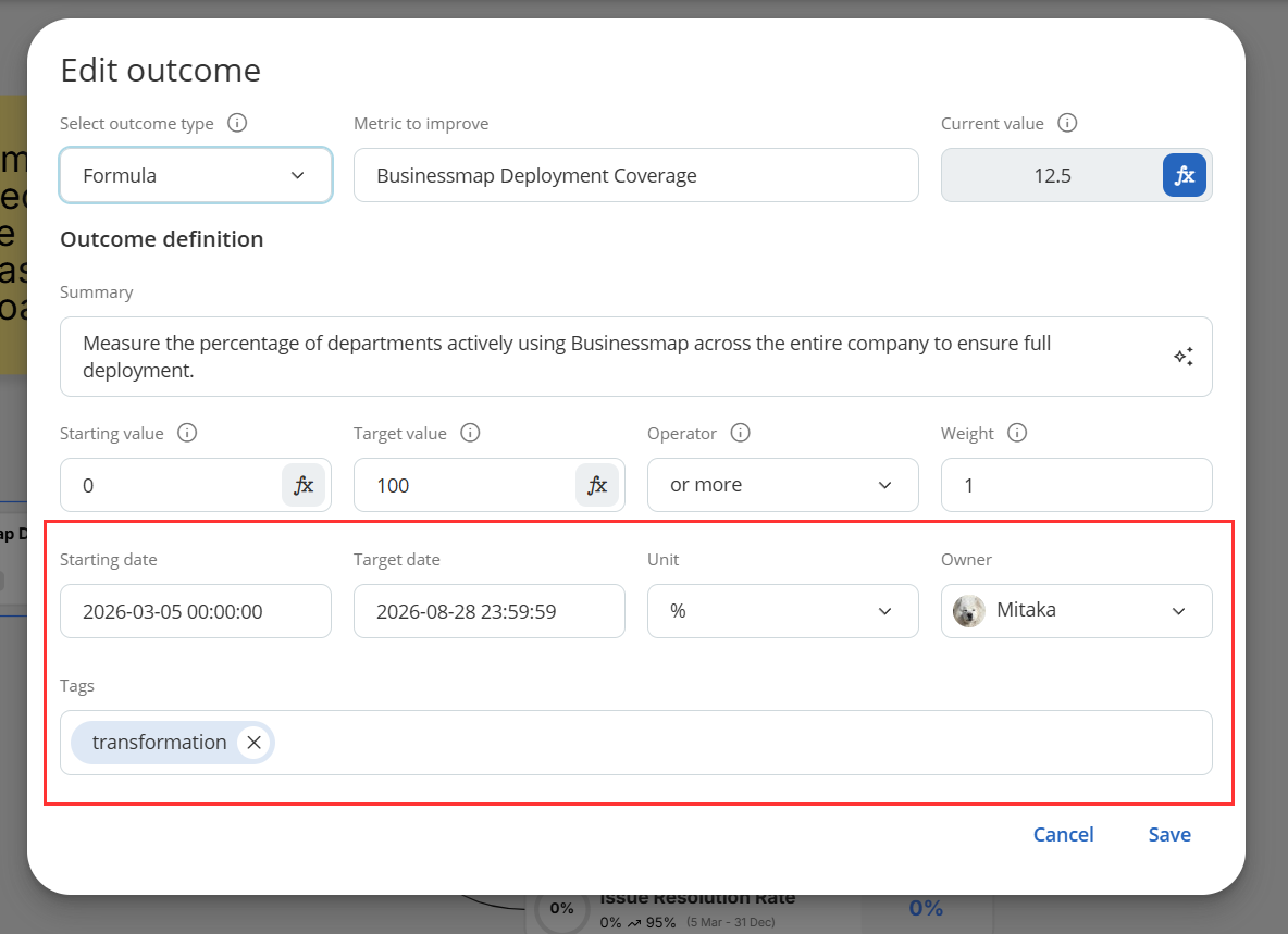 We have delivered a significant overhaul of our Outcomes capability in Version 12.04. Outcomes are now global — no longer tethered to individual cards — and come loaded with enhanced attributes like owners, tags, dates, and flexible measurement units. We've also made it possible to define outcomes in plain human language, with Businessmap automatically extracting the key details, while an updated visualization surfaces real-time progress, co-owners, and other properties in a single compact view.
