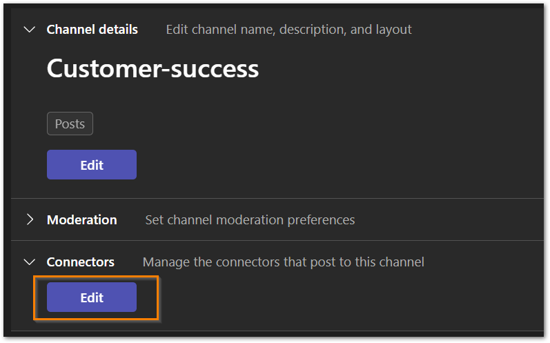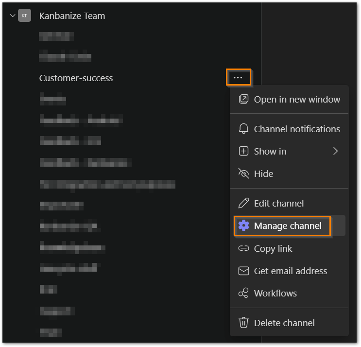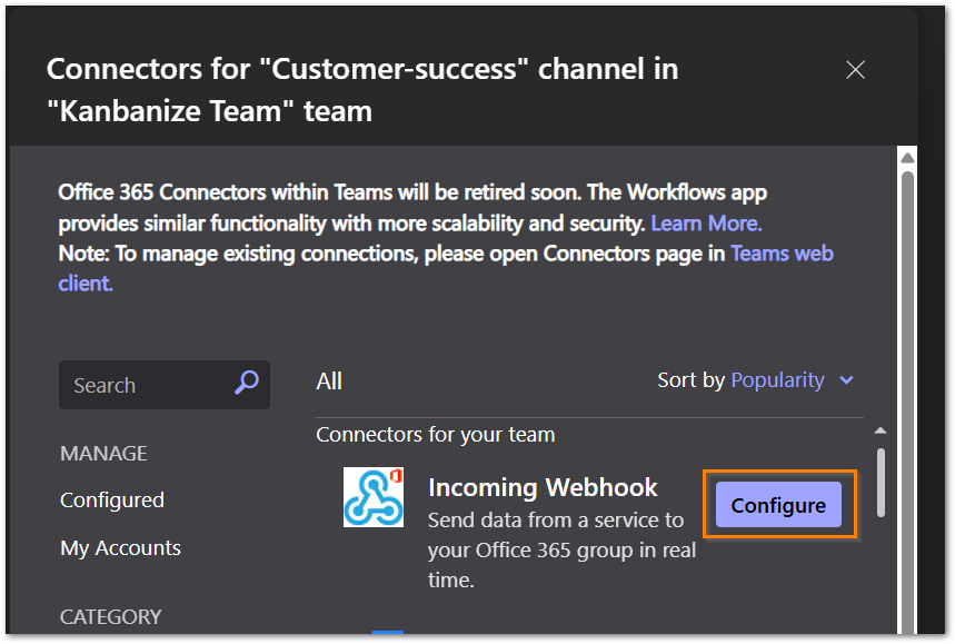 1. Locate your Teams channel and open the Manage channel -> Connectors settings: