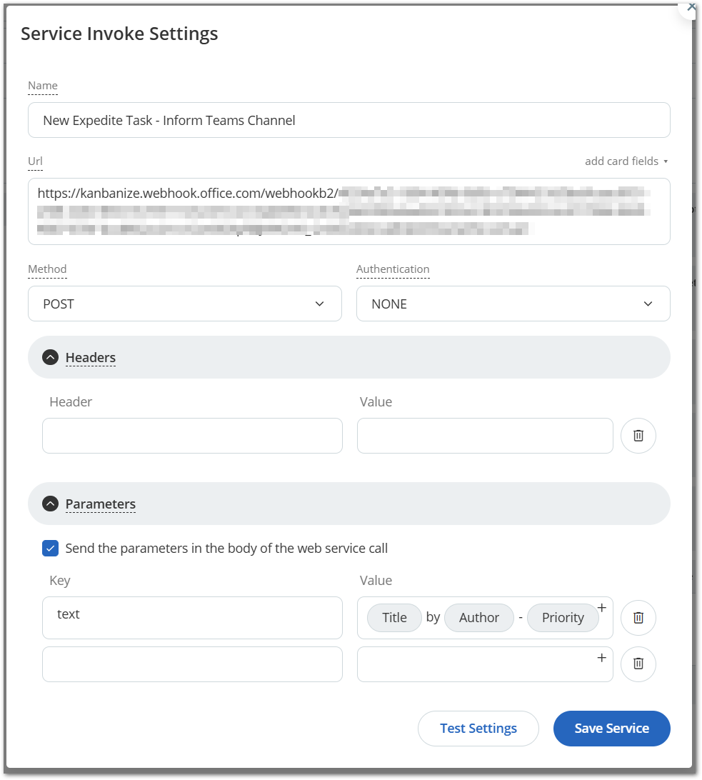5. Create a Business Rule with a trigger that fits your scenario. Create Card, Update Card, Move Card, and so on. At the Invoke Web Service action, set up the following parameters: