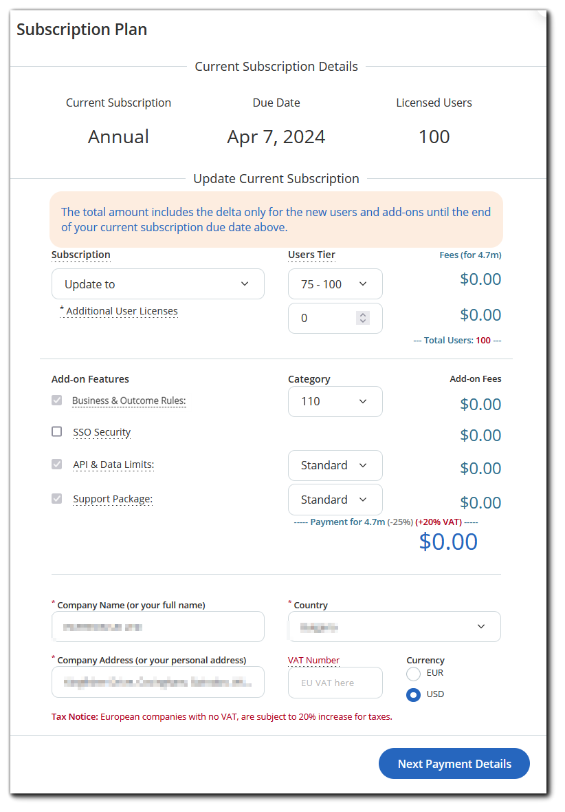Step 3: To upgrade your annual subscription, i.e. to increase the number of users, business rules or to enable more add-ons, you need to make the changes in the respective fields according to your needs.