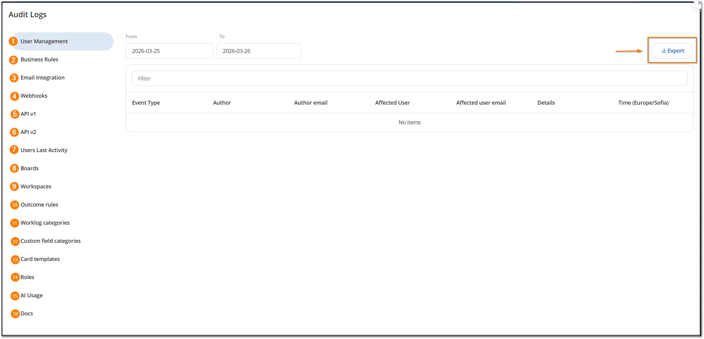 Note: There is a total limit of 10000 results that can be returned. The results are displayed by 200 per page within each of the Audit Log categories. For analyzing the full log, use the “Export” button to download all the information for the selected time frame.